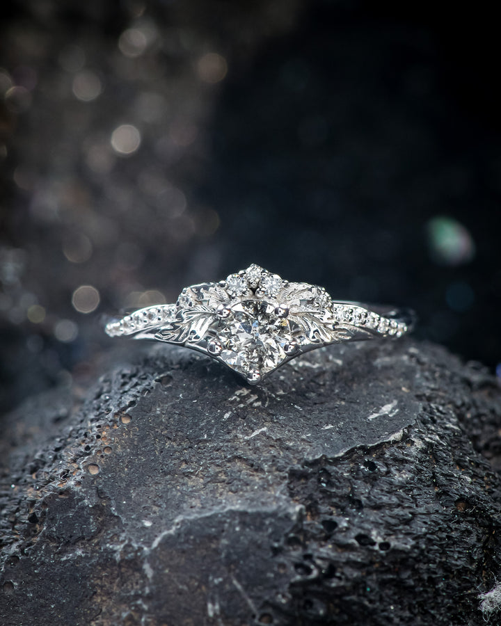 Magnificent wedding ring features a nature-inspired design with highly detailed tiny leaves.