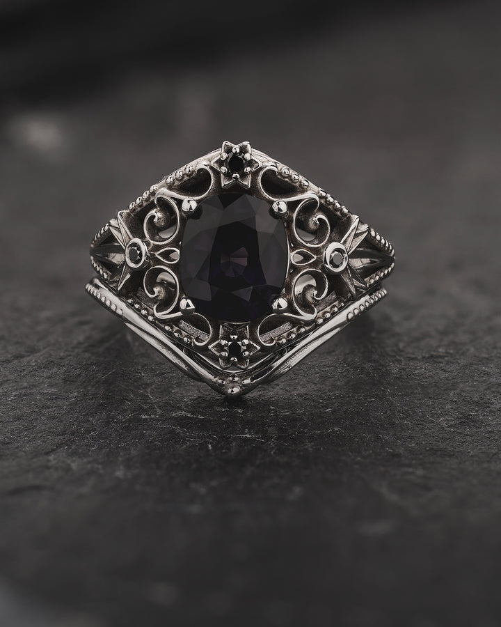 Unique Cosmic Bridal Set with Grey Spinel & Black Diamonds Engagement Ring / Galaxia