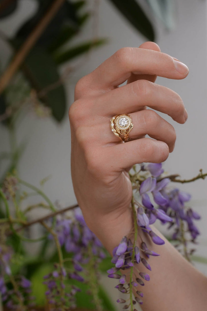 Halo engagement ring shows both classical and rustic style. Skilfully sculpted leaves and vines looks very realistic and holds setting with lab grown diamond. It is set in a bezel and framed with manmade or natural diamond halo: you can choose preferred option.