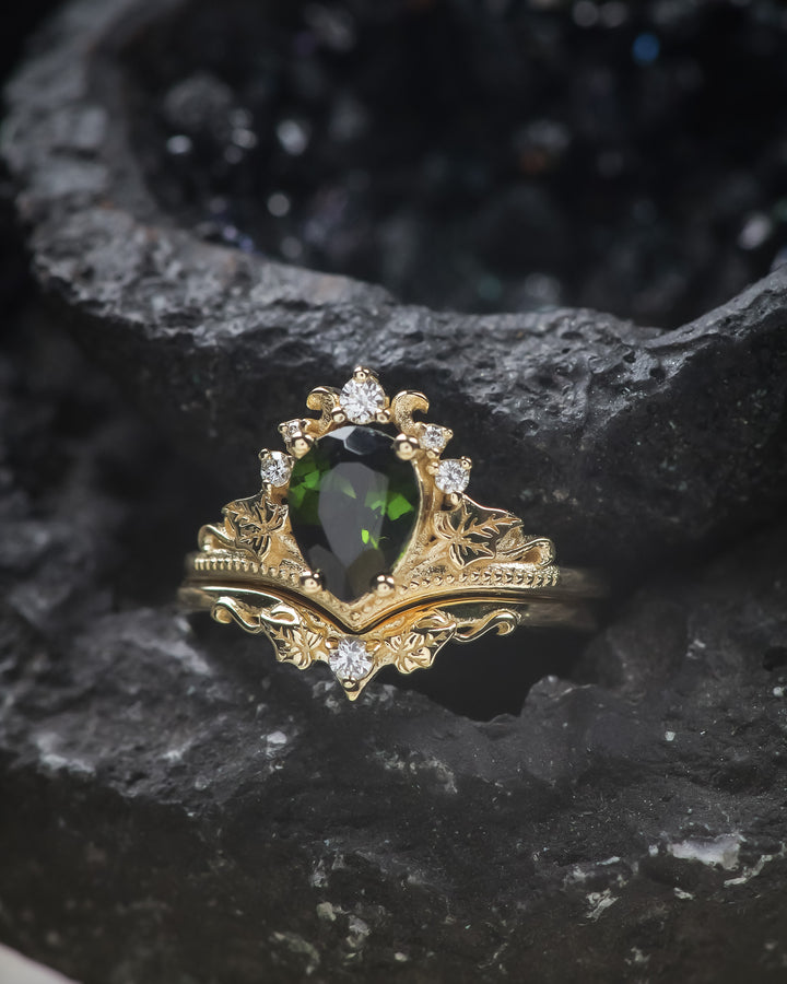 Magnificent wedding ring set features nature inspired style with tiny ivy leaves and the most delicate details you can imagine. This version comes with pear cut gemstone - natural green tourmaline. It will be a great choice for those looking for untraditional yet elegant and timeless engagement ring.
