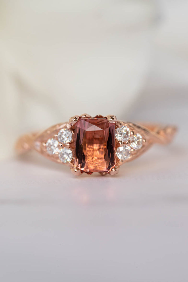 READY TO SHIP: Gloria ring in 14K rose gold, natural pink tourmaline emerald cut 7x5 mm, accents moissanites, AVAILABLE RING SIZES: 5.5 - 8.5 US