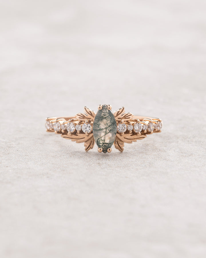 Marquise cut moss agate engagement ring, nature inspired gold leaf ring