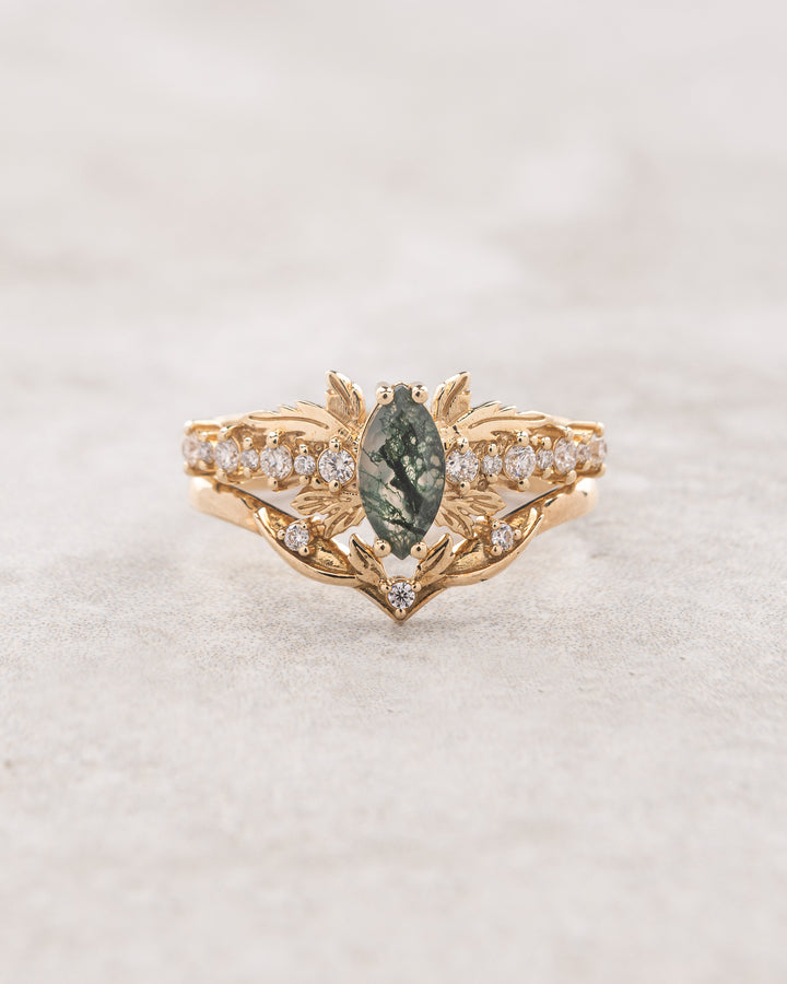 Marquise cut moss agate bridal ring set, nature inspired engagement ring / Verbena