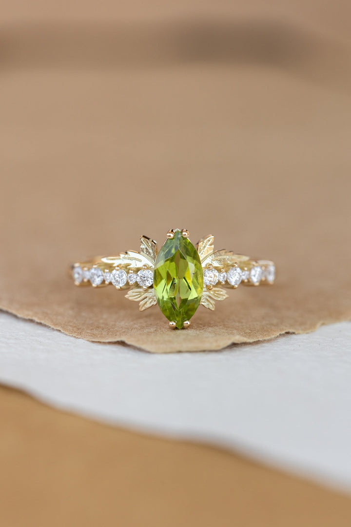 Peridot and diamonds engagement ring, nature inspired gold leaf ring / Verbena