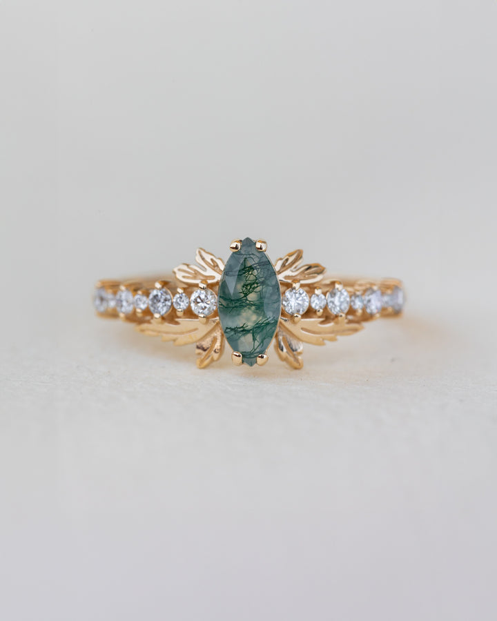 READY TO SHIP: Verbena ring in 18K yellow gold, natural moss agate marquise cut 8x4 mm, accents lab grown diamonds, RING SIZE: 5.5 - 8.5 US