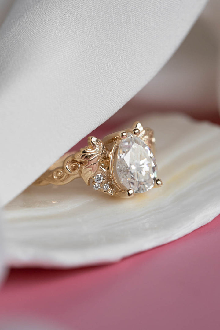 1 carat lab grown diamond engagement ring, gold leaves proposal ring with diamonds