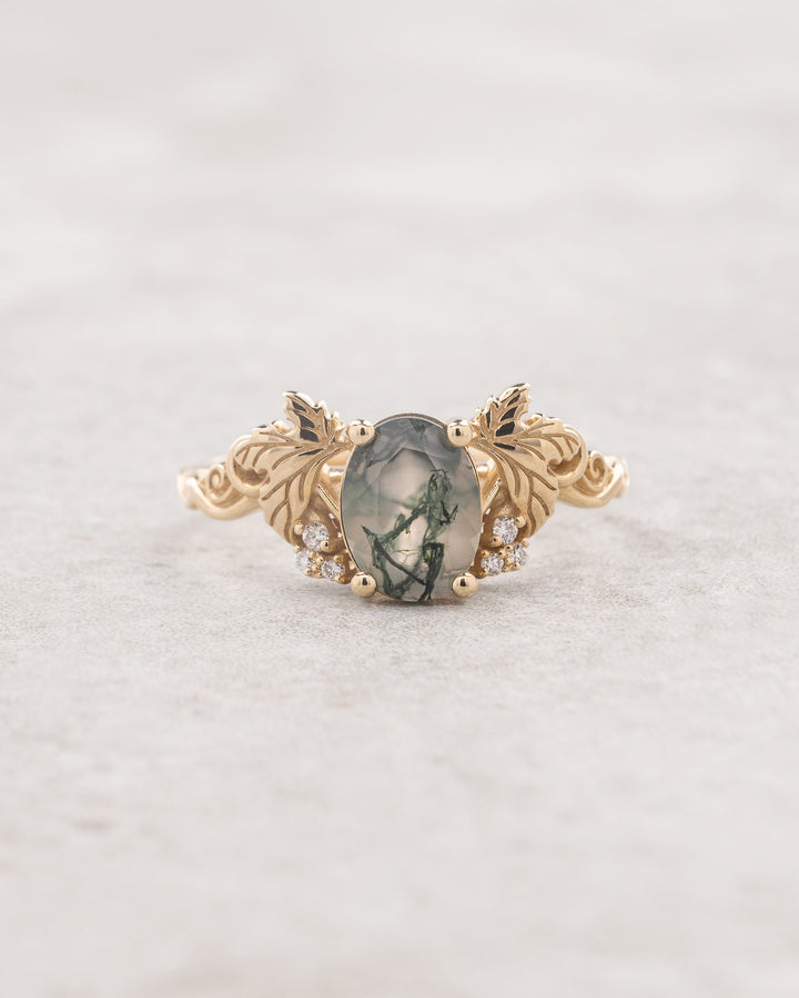 Moss agate and diamonds engagement ring, gold leaf and vine engagement ring / Vineyard