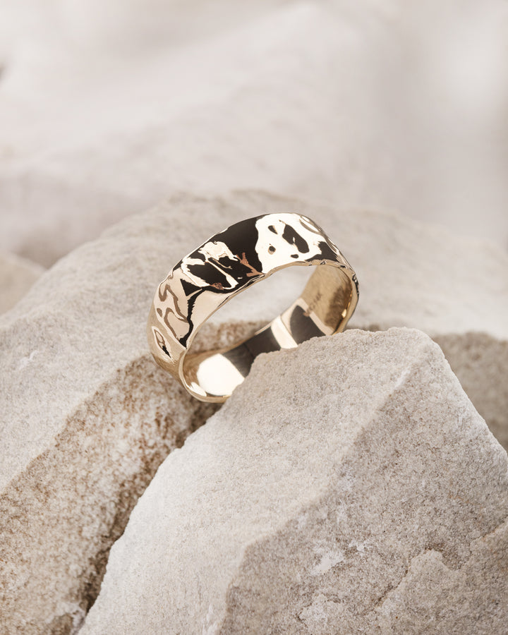 This man's band has a wide profile with a unique texture of naturally melted metal. It has an original yet minimal look, great for those who're looking for a stylish wedding ring suitable for everyday wear. It will be made in the requested size and desirable gold colour.