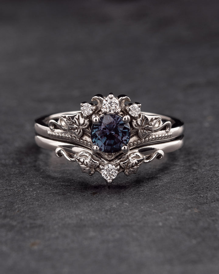 Magnificent wedding ring set features nature inspired style with tiny ivy leaves and the most delicate details you can imagine. Round cut lab alexandrite has great colour changing properties. Small accent diamonds compliments this romantic jewelry piece.
