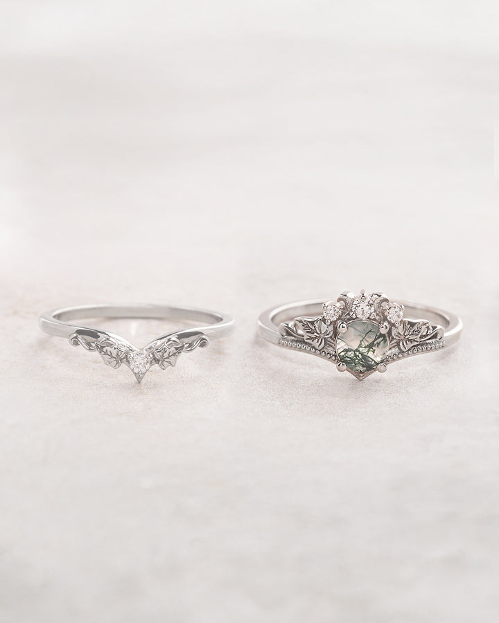 Magnificent wedding ring set features nature inspired style with tiny ivy leaves and the most delicate details you can imagine. This version comes with round cut gemstone - natural moss agate. It will be a great choice for those looking for untraditional yet elegant and timeless engagement ring.
