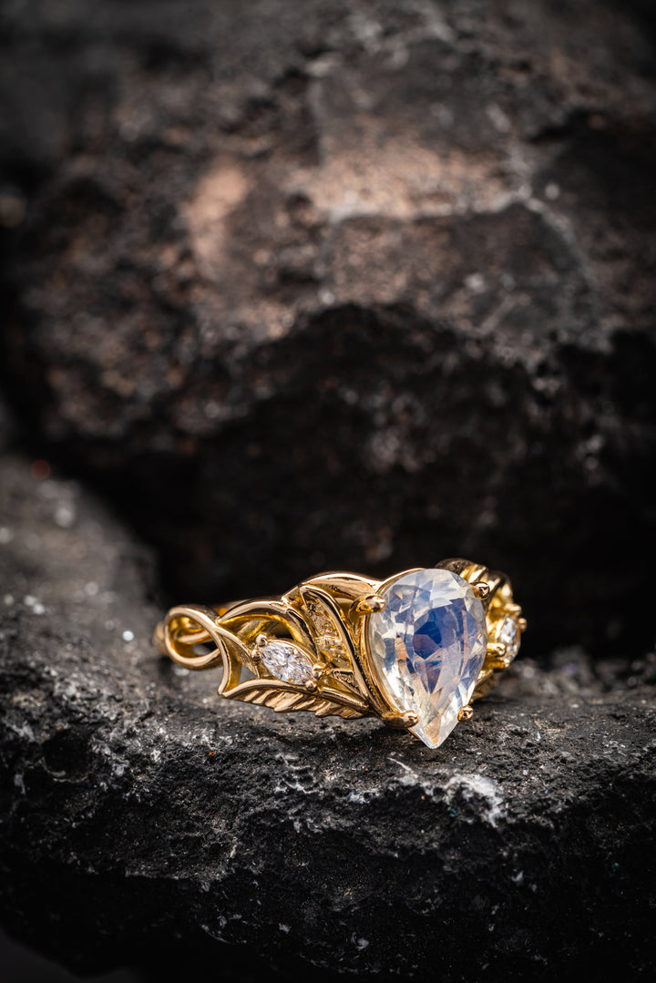 READY TO SHIP: Ikar ring in 14K yellow gold, moonstone pear cut 10x7 mm, accent lab grown diamonds, AVAILABLE RING SIZES: 5.5 - 8.5 US