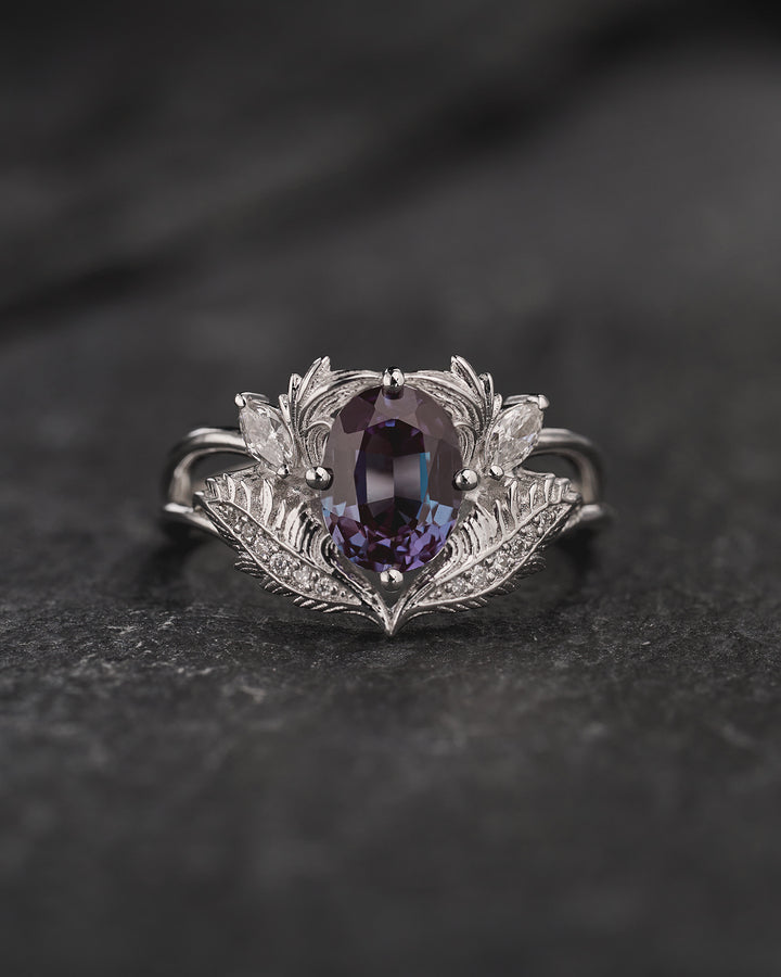 This unique engagement ring features author's design inspired by nature. Solid gold ring is adorned with oval cut lab alexandrite, accent stones: marquise-cut and round-cut lab-grown diamonds. Leaves are highly detailed and feature the best quality of fine jewelry work.