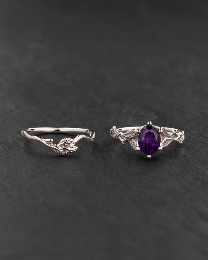 Amethyst engagement ring with a matching leaf wedding band / Freesia - Eden Garden Jewelry™