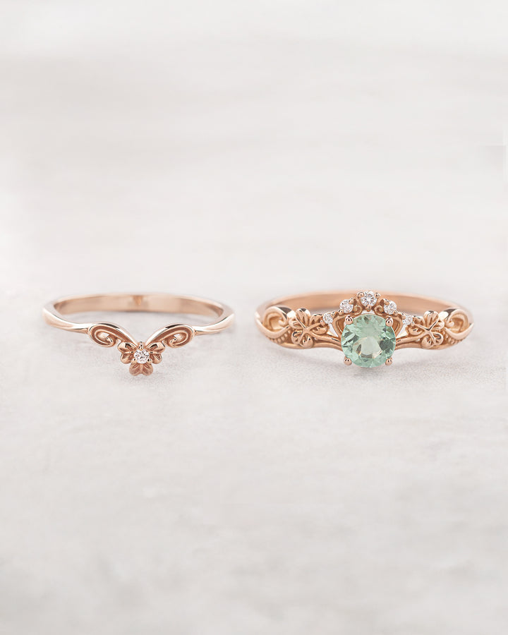 READY TO SHIP: Horta bridal ring set with mint green tourmaline and natural diamonds, 18K rose gold, AVAILABLE RING SIZES: 7.5 - 10.5 US