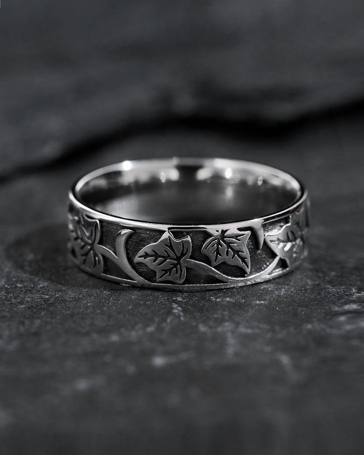 Original yet classic this nature wedding band will be a great choice for person who look for comfortable ring to wear everyday. Features ivy leaves pattern created by an artist. To make a contrast look we used black rhodium plating and it gives a modern and stylish twist to a traditional wedding band.