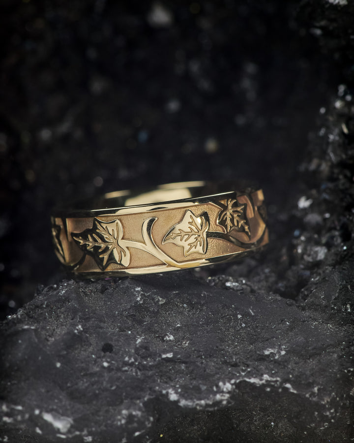 Gold leaf wedding band for man, ivy leaves ring, 6mm - Eden Garden Jewelry™