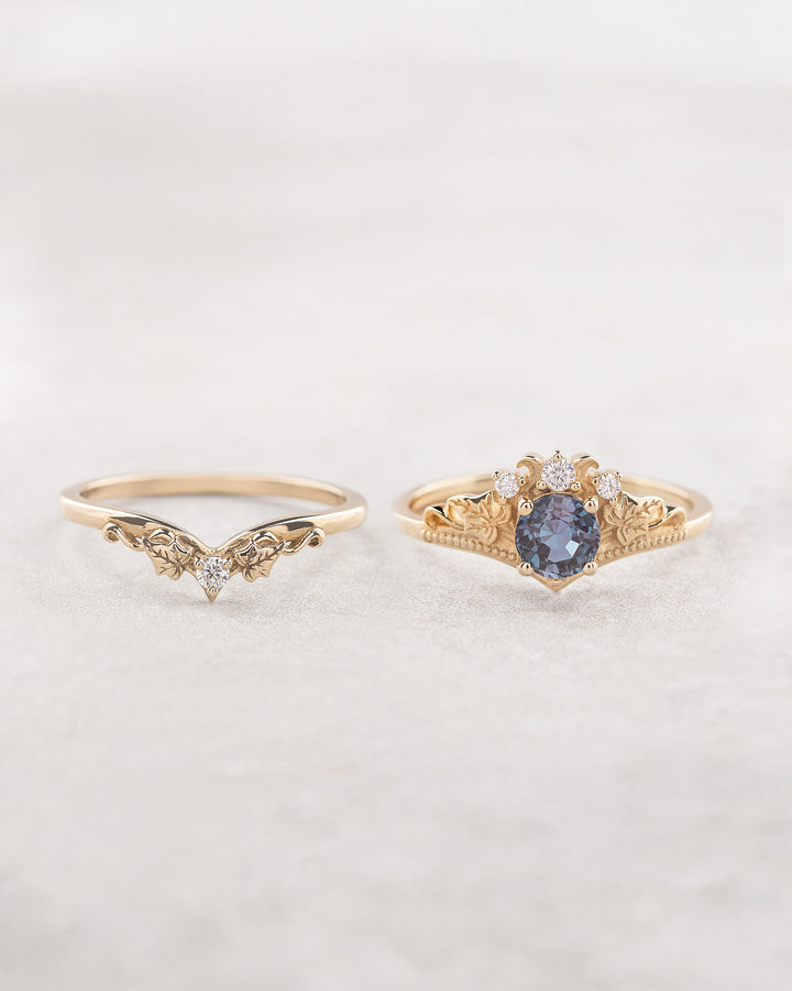 Magnificent wedding ring set features nature inspired style with tiny ivy leaves and the most delicate details you can imagine. Lab alexandrite is truly magical - it changes colours depending on a lighting. It is teal / purple at the daylight and reddish purple under sun or electrical light. Bridal set is complimented with natural diamonds.