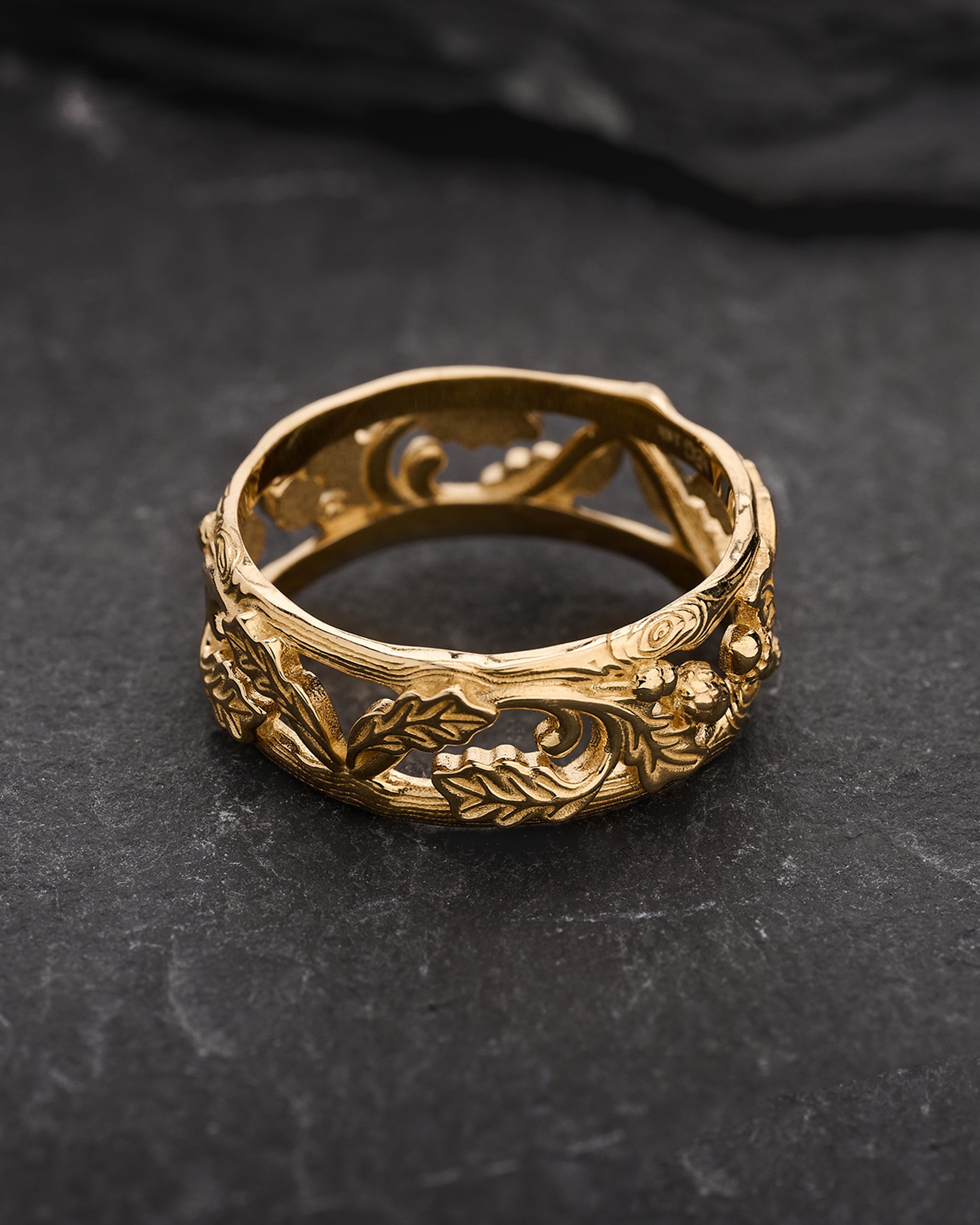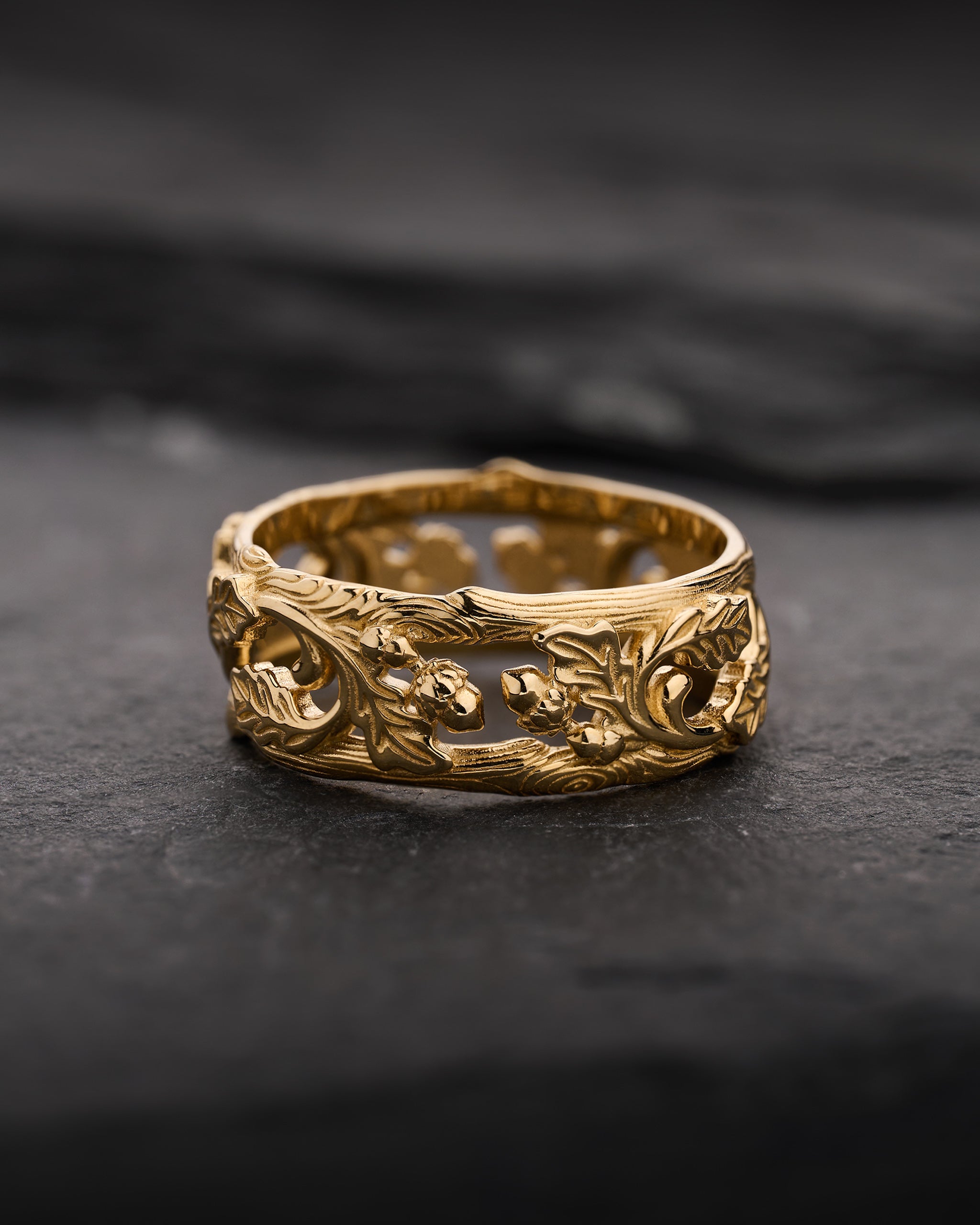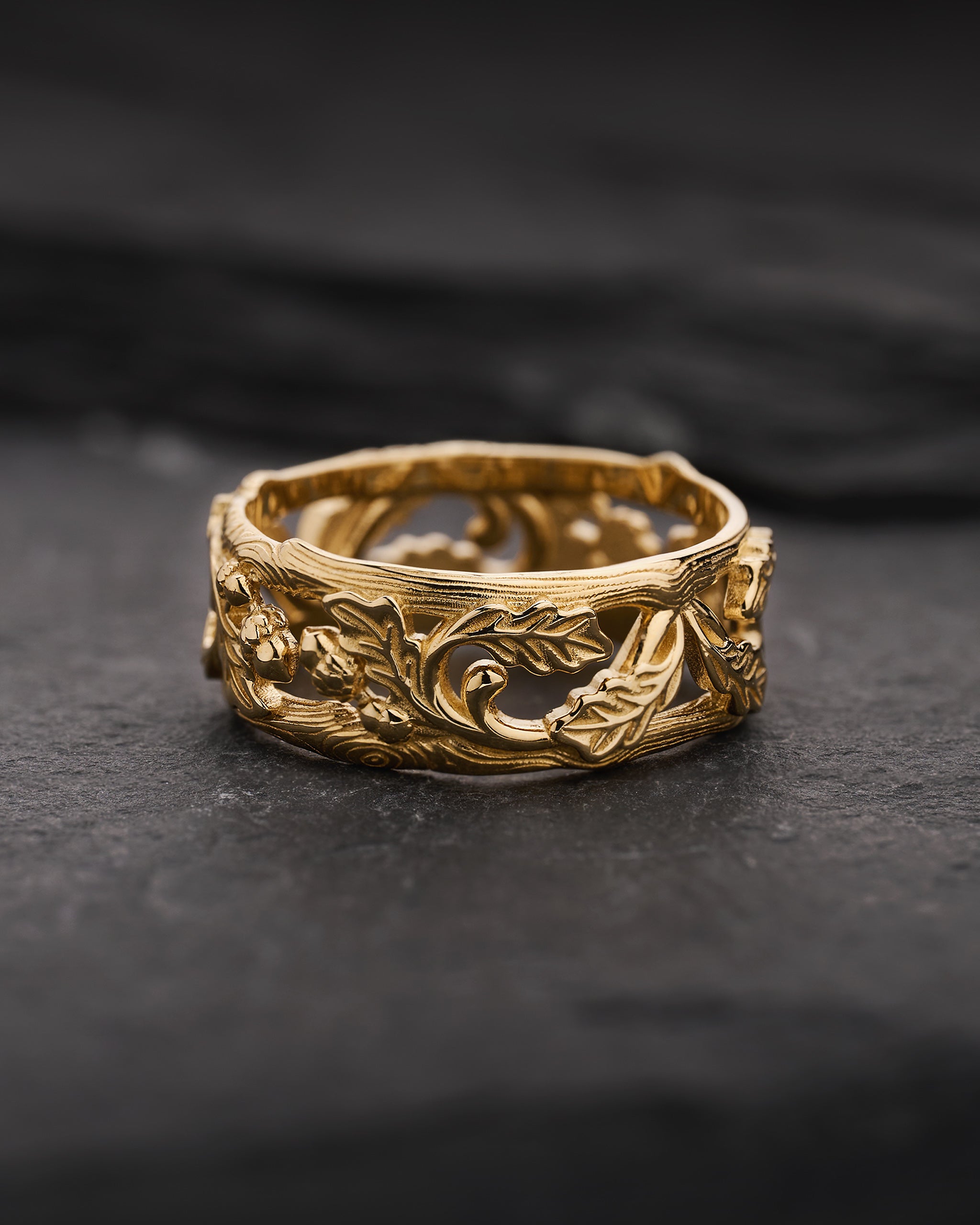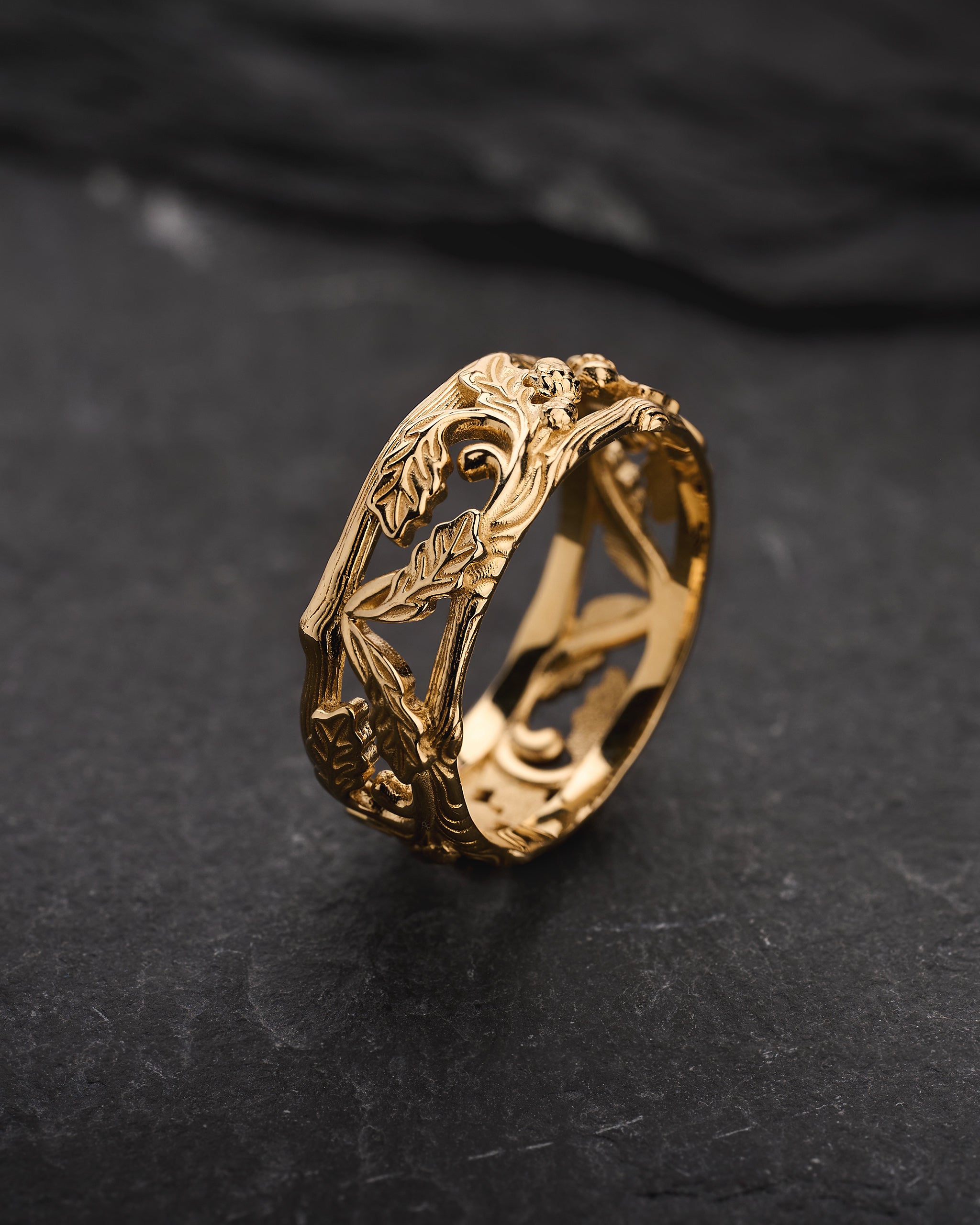 Amazingly detailed our wedding band for man or woman features oak leaves and tiny acorns placed between textured bark. This is our original design and you won't see it mass produced.