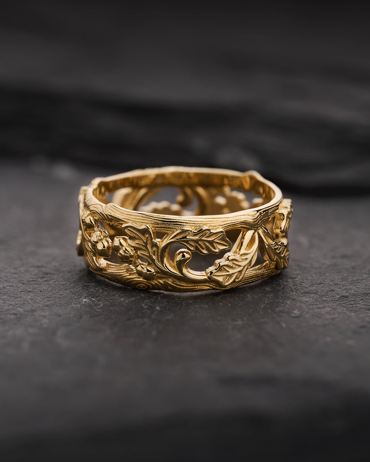 This nature wedding band is skilfully sculpted and looks classy and unusual. Perfect rustic wedding band for those who admires nature and timeless style. Could be suitable for woman as well.