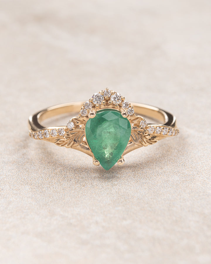 Natural big emerald and diamonds engagement ring, gold leaf ring / Amelia