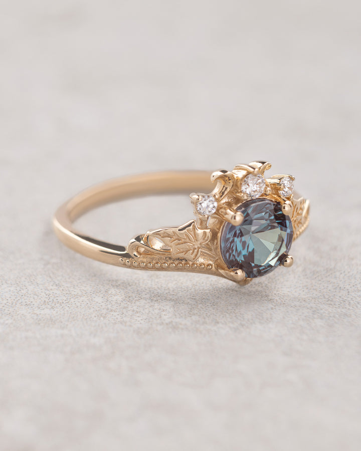 Magnificent engagement ring features nature inspired style with tiny ivy leaves and the most delicate details you can imagine. This version comes with round cut gemstone - color changing lab alexandrite. It will be a great choice for those looking for untraditional yet elegant and timeless engagement ring.