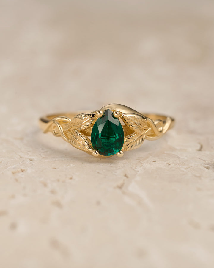Our leaf engagement Azalea ring may be an exquisite and unique gift for your wife, bride, girlfriend or any other special woman in your life. Handcrafted from recycled solid gold it is adorned with pear cut emerald (natural or lab created).