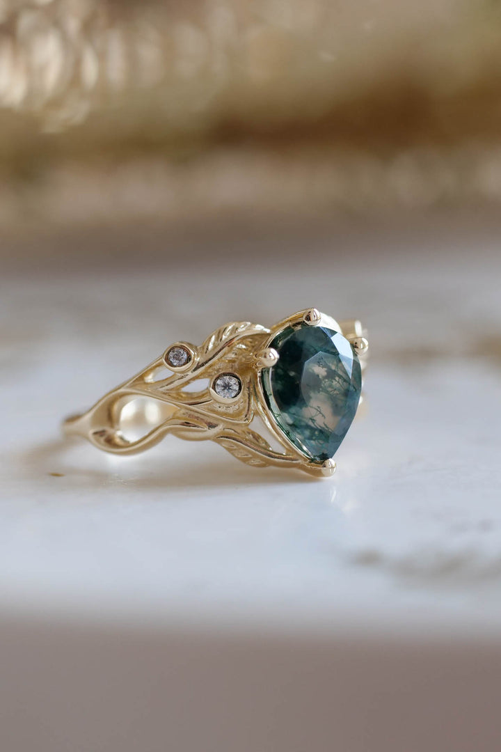 READY TO SHIP: Callisto in 14K yellow gold, pear moss agate 8x6 mm, moissanites, RING SIZE 4.25 - 7.25 US
