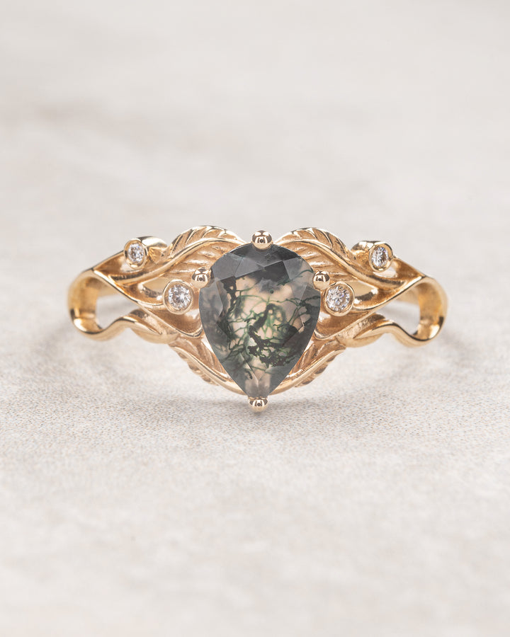 Callisto name came from Greek and means "most beautiful". This art nouveau inspired engagement ring is truly one of the most exquisite from our collection. It features central pear cut gemstone complimented by sparkling diamonds and hold by skilfully make leaves composition.
