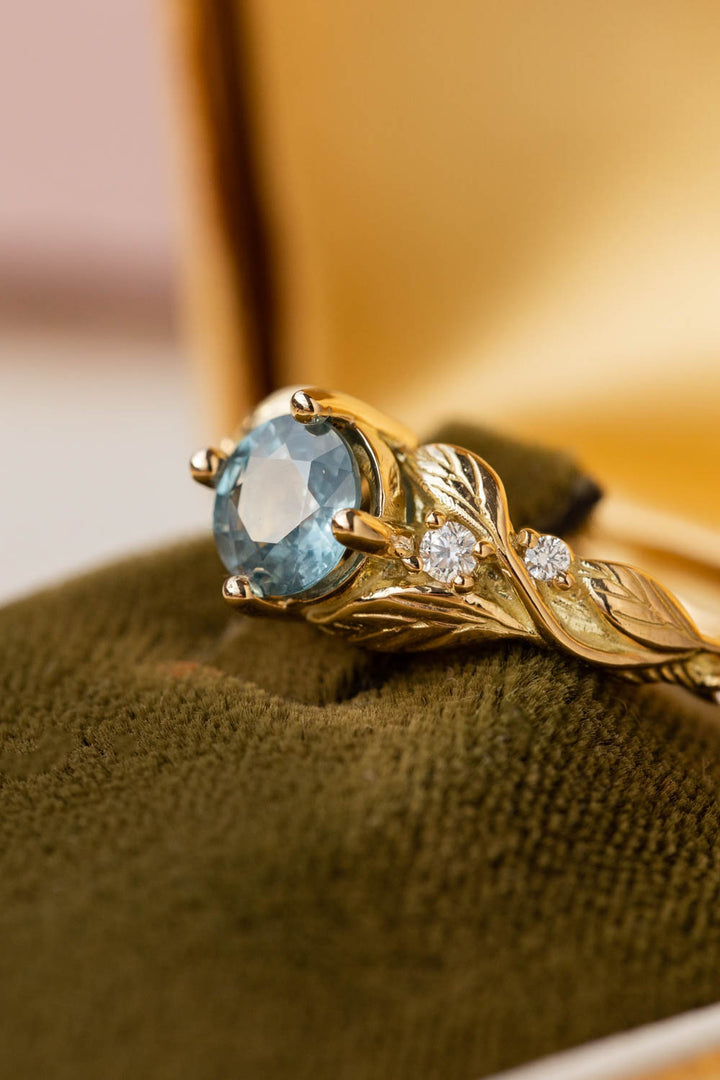Blue sky sapphire engagement ring, gold leaves and accent diamonds proposal ring