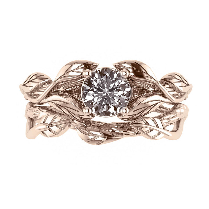 Handcrafted from solid gold this leaves band would be perfect for the alternative engagement ring seeker. Round cut gemstone ring shows nature inspired jewelry piece with a modern twist. The Clematis engagement ring features a textured branch with naturally looking leaves.