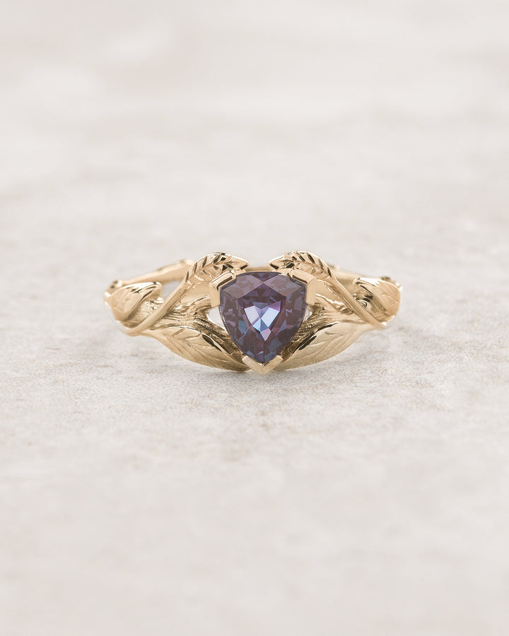 Skilfully crafted from solid gold this branch ring captivates with colour changing gemstone. Trillion cut gemstone ring shows nature inspired jewelry piece with a modern twist. The Clematis engagement ring featuring lab alexandrite, but can be made with other stones as well. This is our original design created for alternative engagement ring seekers.