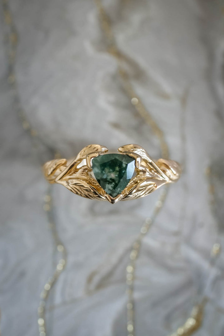 Handcrafted from solid gold this leaves band would be perfect for alternative engagement ring seekers. Trillion cut gemstone ring shows nature inspired jewelry piece with a modern twist. The Clematis engagement ring features here natural moss agate.
