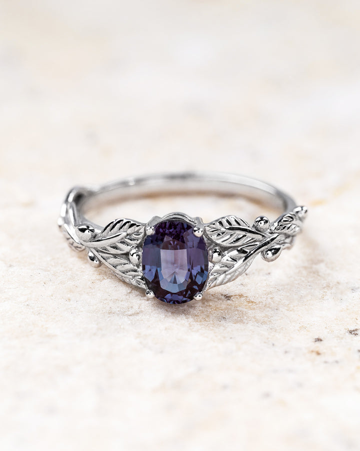 Alexandrite engagement ring, oval cut gemstone gold leaf promise ring / Cornus slim version
