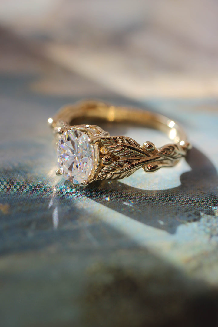 Lab grown diamond engagement ring, oval cut gemstone gold leaf promise ring