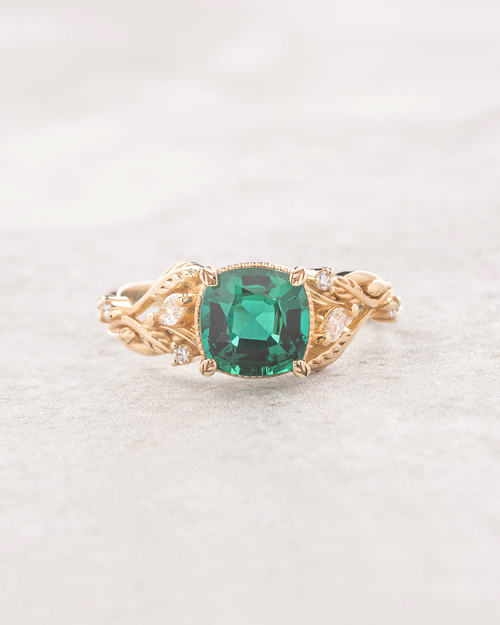 Cushion lab emerald and diamonds bridal ring set, stacking rings for a faerie bride / Patricia - Eden Garden Jewelry™