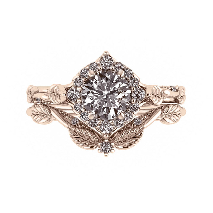 We named this ring Florentina - it comes from the Roman name Florentius, which was from the Latin word florens, meaning "to bloom". The central gemstone, surrounded by a rich diamond halo, is set on a delicate branch and surrounded by lovely petals - this composition is reminiscent of a flower bud, and the leaf shapes are inspired by rose vines.