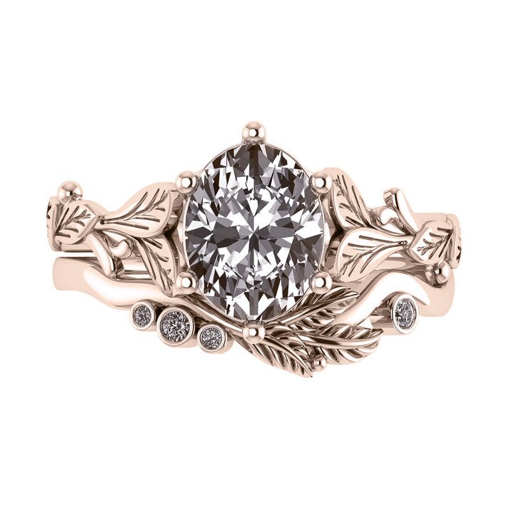 It's all about harmony and romance. The Freesia engagement ring set is the perfect expression of your tender feelings and serious intentions. Handcrafted from solid gold, this engagement ring set features detailed leaves and organic lines wrapped around the central gemstone.