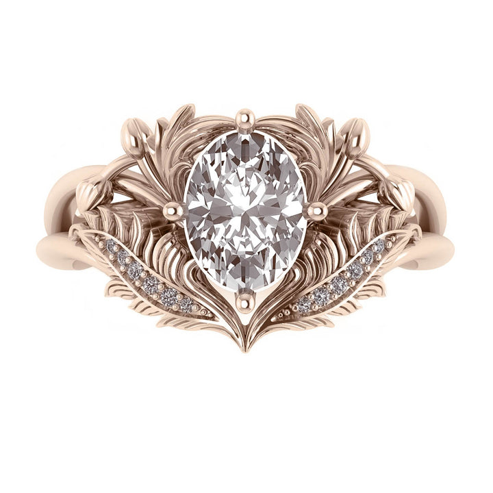Adonis engagement ring style features author's design inspired by nature. Ring is adorned with oval cut gemstone surrounded by leaves and buds. Feathered leaves are highly detailed and shows the best quality of fine jewelry work. Small diamonds are lined in a pave setting and add a charming sparkle.