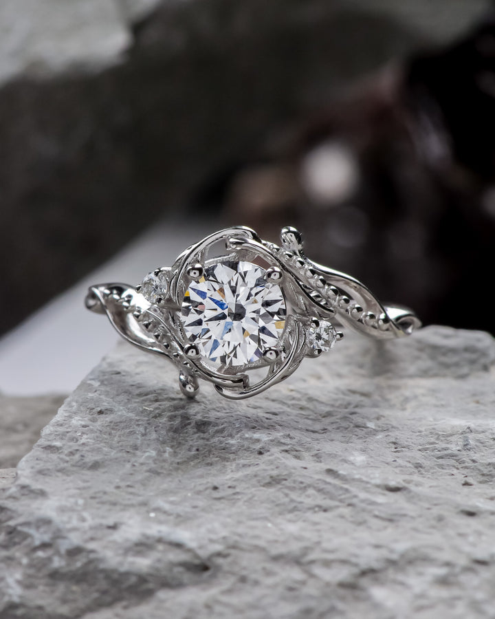 Hypnotising flow of art nouveau style is a feature of this engagement ring. Wavy lines are adorned with enlarged milgrain reminiscent water bubbles swirling around the focal gemstone. Flowing stamens and small leaves complete the whole composition.