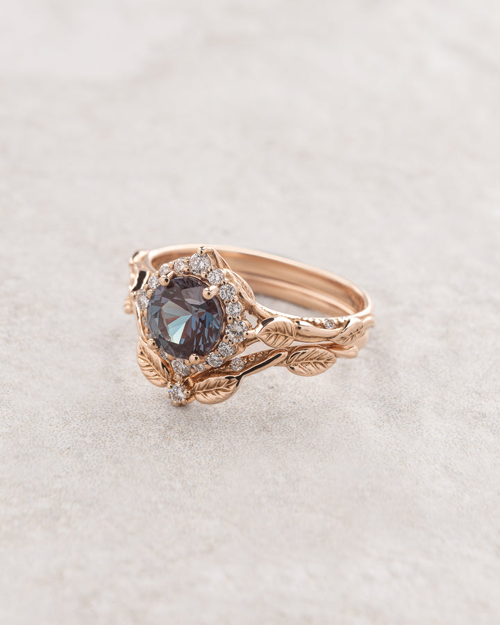 Lab alexandrite bridal ring set with diamond halo, romantic leaf ring