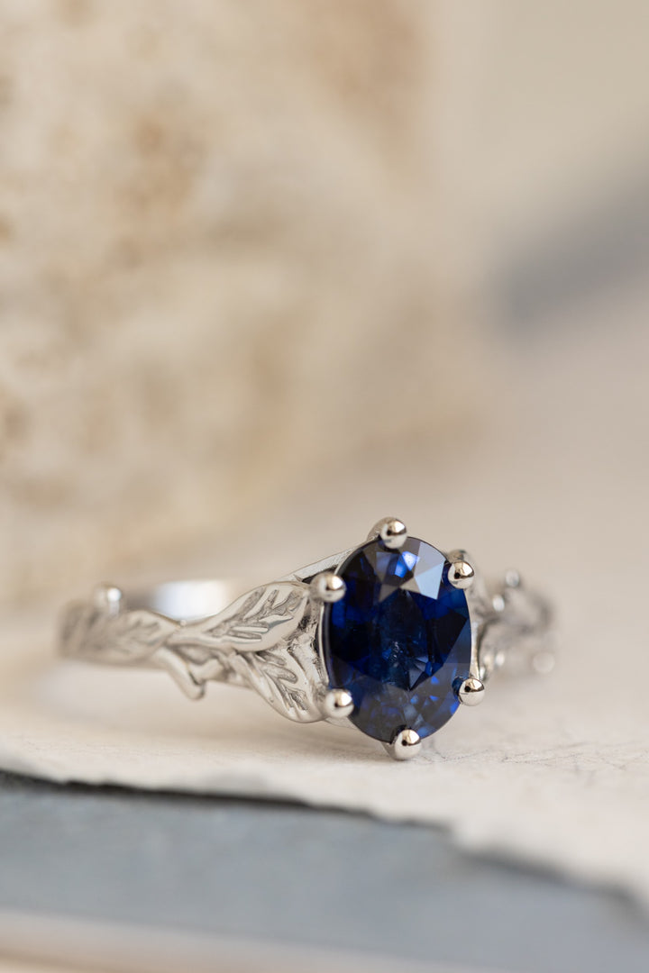 Lab sapphire gold leaf engagement ring, oval cut gemstone proposal ring