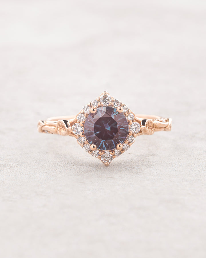 READY TO SHIP: Florentina ring in 14K rose gold, alexandrite, round-cut 6.5mm, accent lab grown diamonds, AVAILABLE RING SIZE: 5.5 - 8.5 US