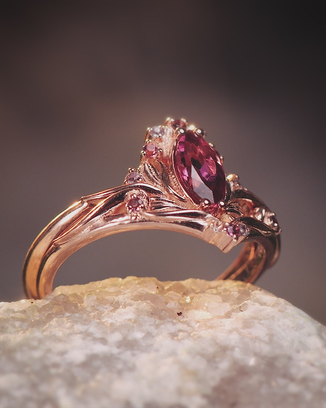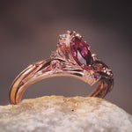 Make a statement of love and elegance with the enchanting Iris bridal set. This nature-inspired masterpiece is a unique ring set that captures the essence of beauty and romance. Reminiscent of a blooming Iris flower bud, the engagement ring features exceptional detailing and a foliage crown sculpted around a marquise-cut pink tourmaline.