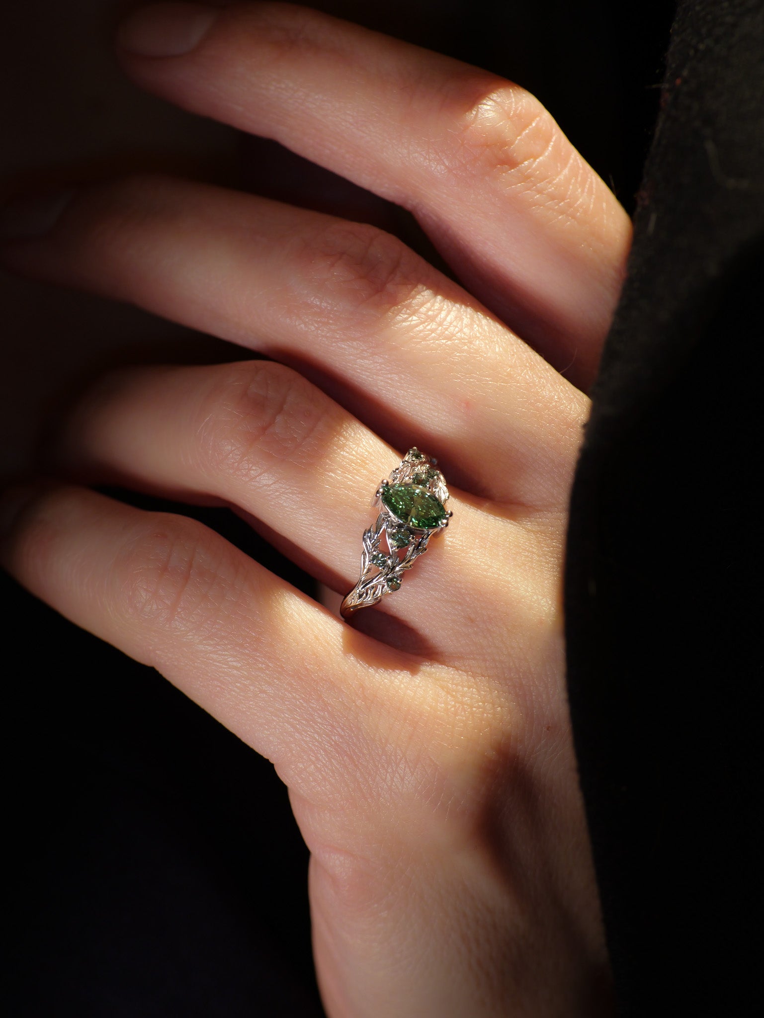 Marquise-cut Green Diamond Engagement Ring with (Natural) Green Sapphires/ Japanese Maple