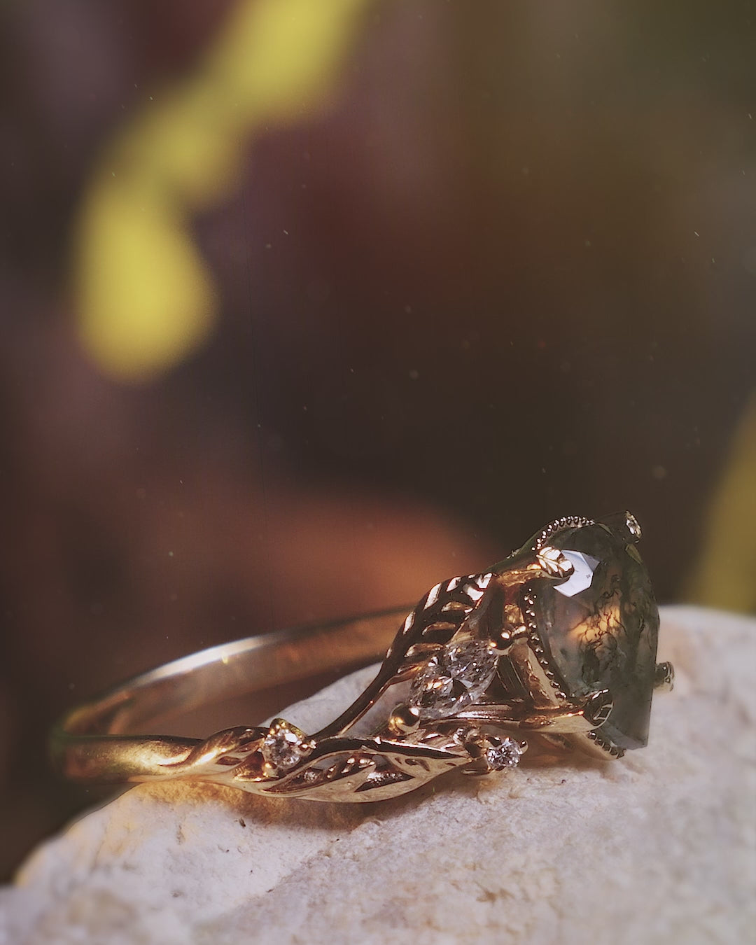 READY TO SHIP: Patricia ring in 14K or 18K yellow gold, natural moss agate pear cut 8x6 mm, accent moissanites, AVAILABLE RING SIZES: 4 - 9 US - Eden Garden Jewelry™