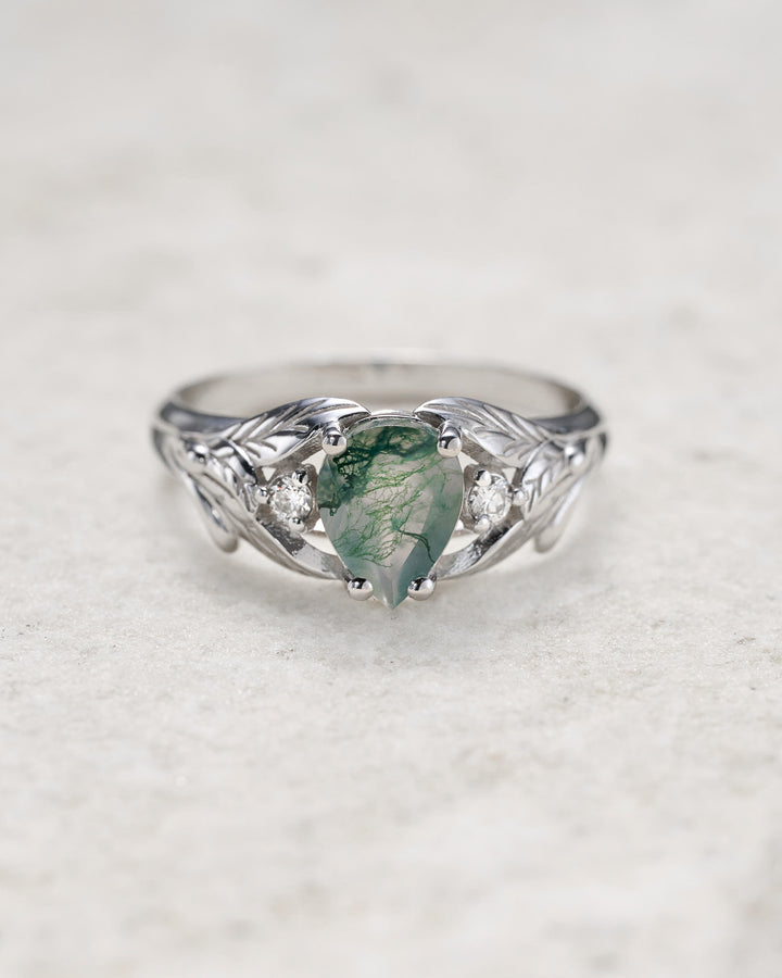 This Wisteria engagement ring features pear cut natural green moss agate. Unique proposal ring is adorned with two accent diamonds.