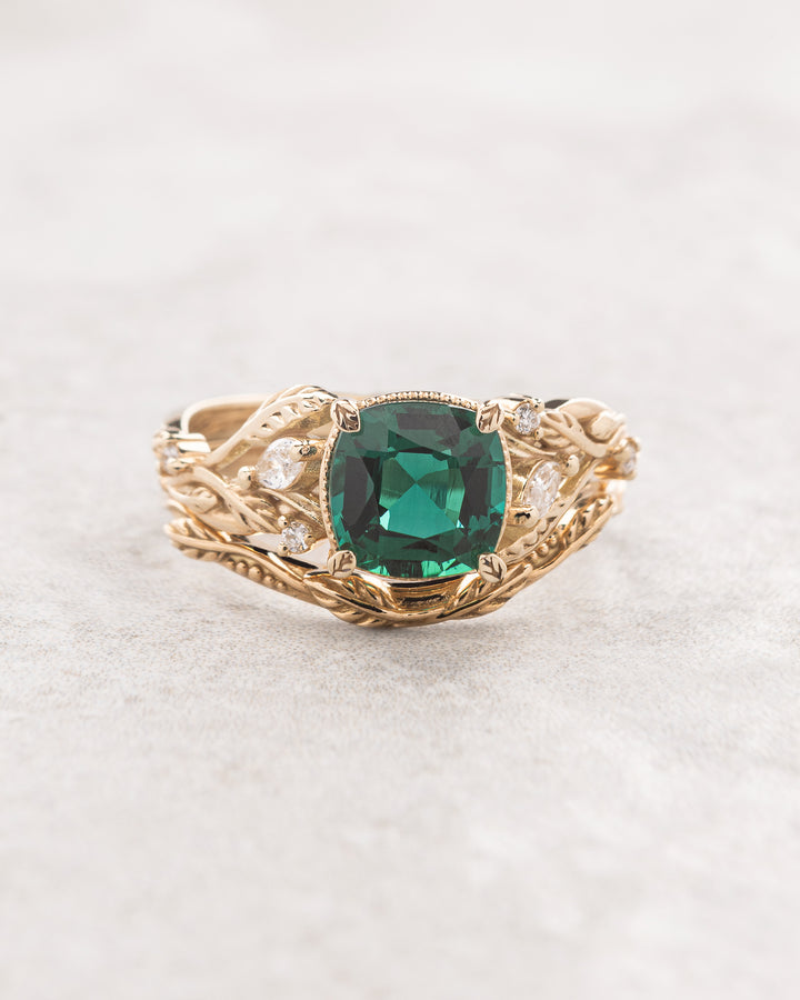 Cushion lab emerald and diamonds bridal ring set, stacking rings for a faerie bride / Patricia - Eden Garden Jewelry™