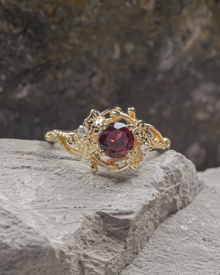 READY TO SHIP: Undina engagement ring in 14K yellow gold, round garnet & accent lab diamonds, RING SIZES: 5.5 - 8.5 US - Eden Garden Jewelry™