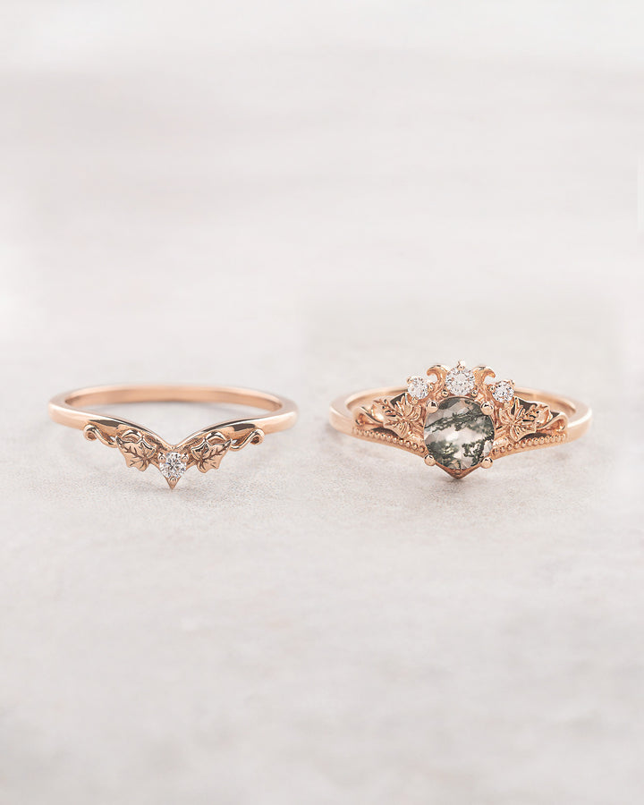 Magnificent wedding ring set features nature inspired style with tiny ivy leaves and the most delicate details you can imagine. This version comes with round cut gemstone - natural moss agate. It will be a great choice for those looking for untraditional yet elegant and timeless engagement ring.