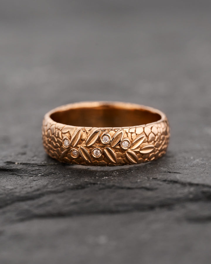 This unusual wedding band is ancient jewelry inspired piece, featuring mosaic texture and olive branch. Solid gold ring for woman is adorned with natural diamonds.Nature woman's ring looks original and modern, you won't find anything similar mass produced. Stylish wedding ring is comfortable for everyday wear.